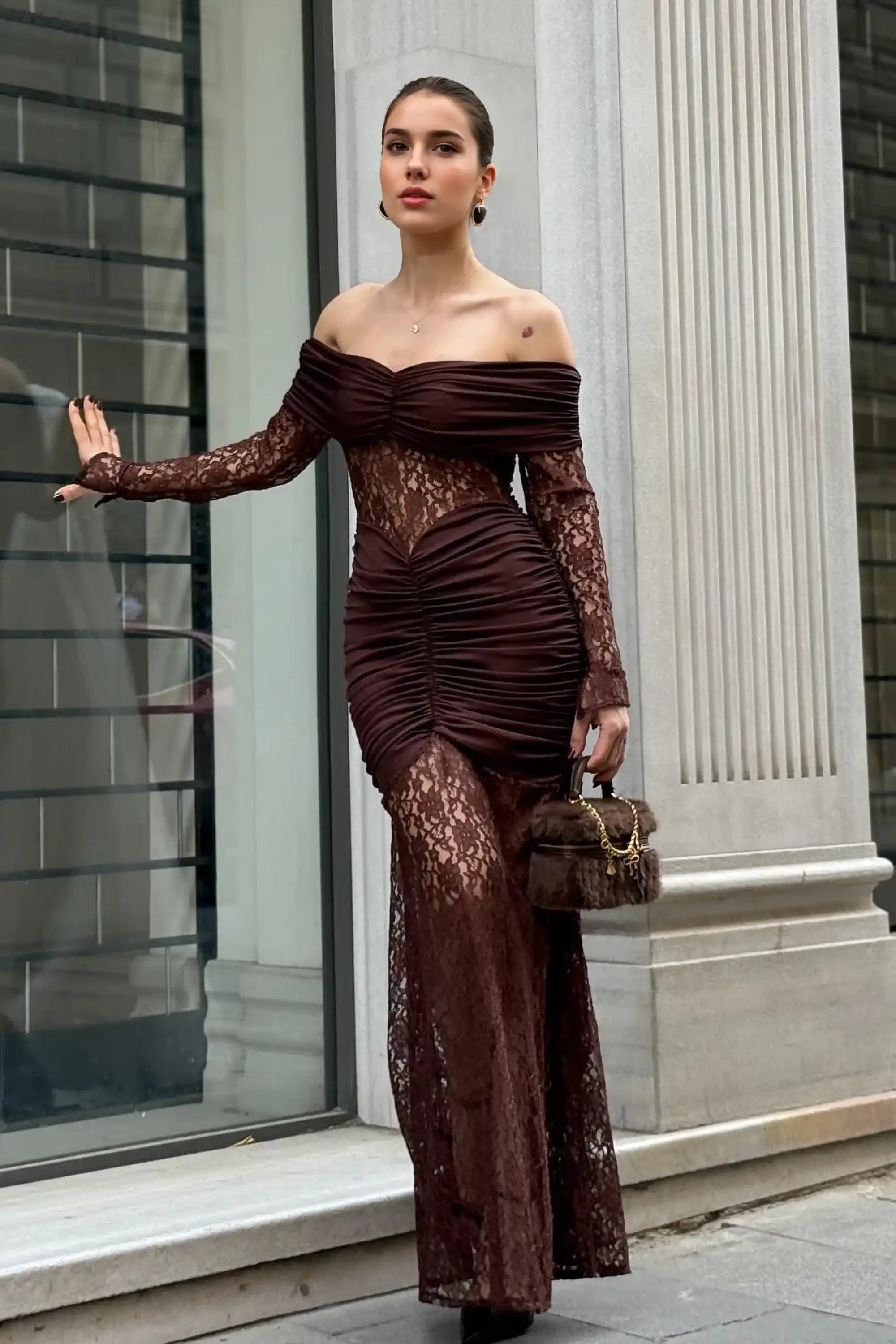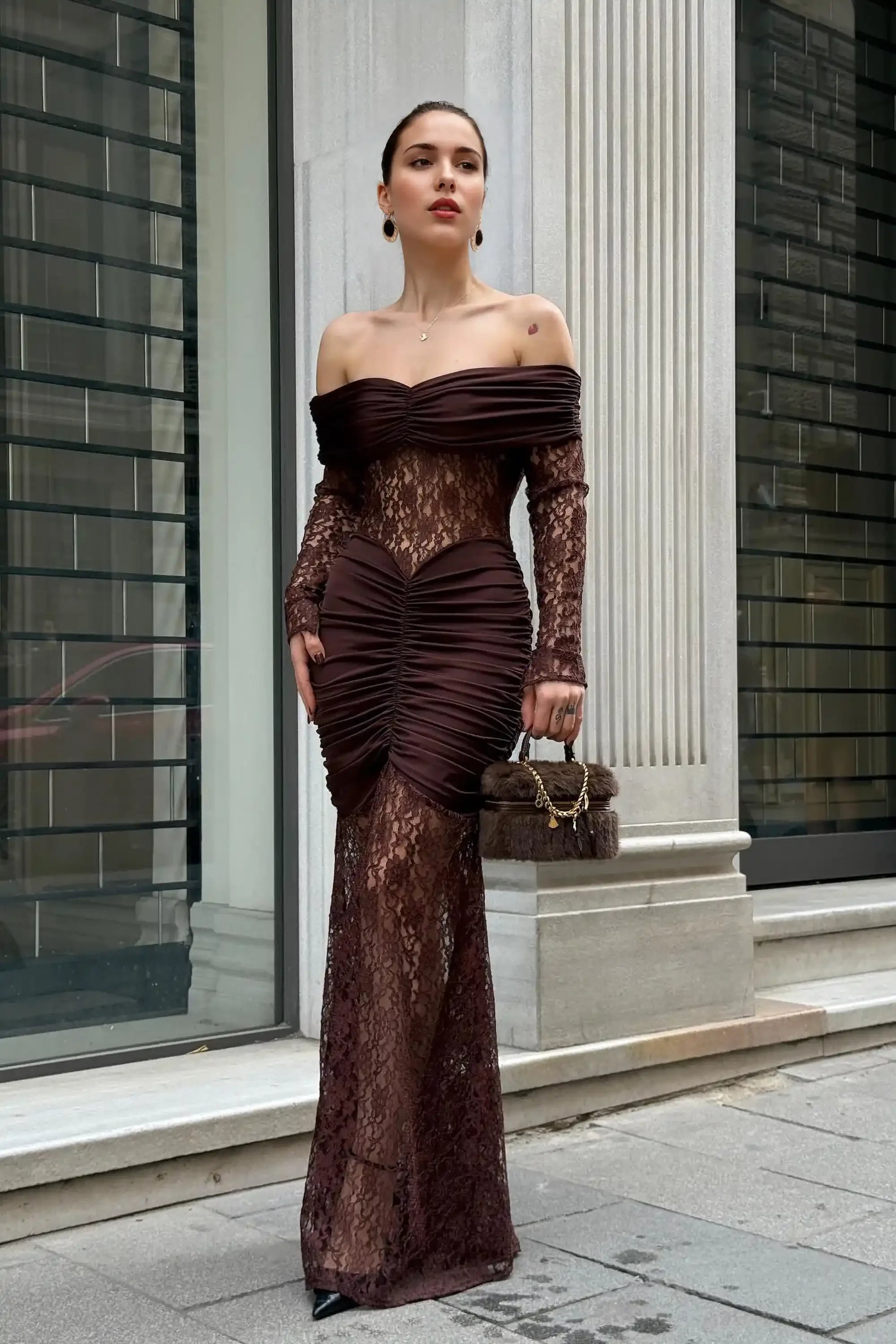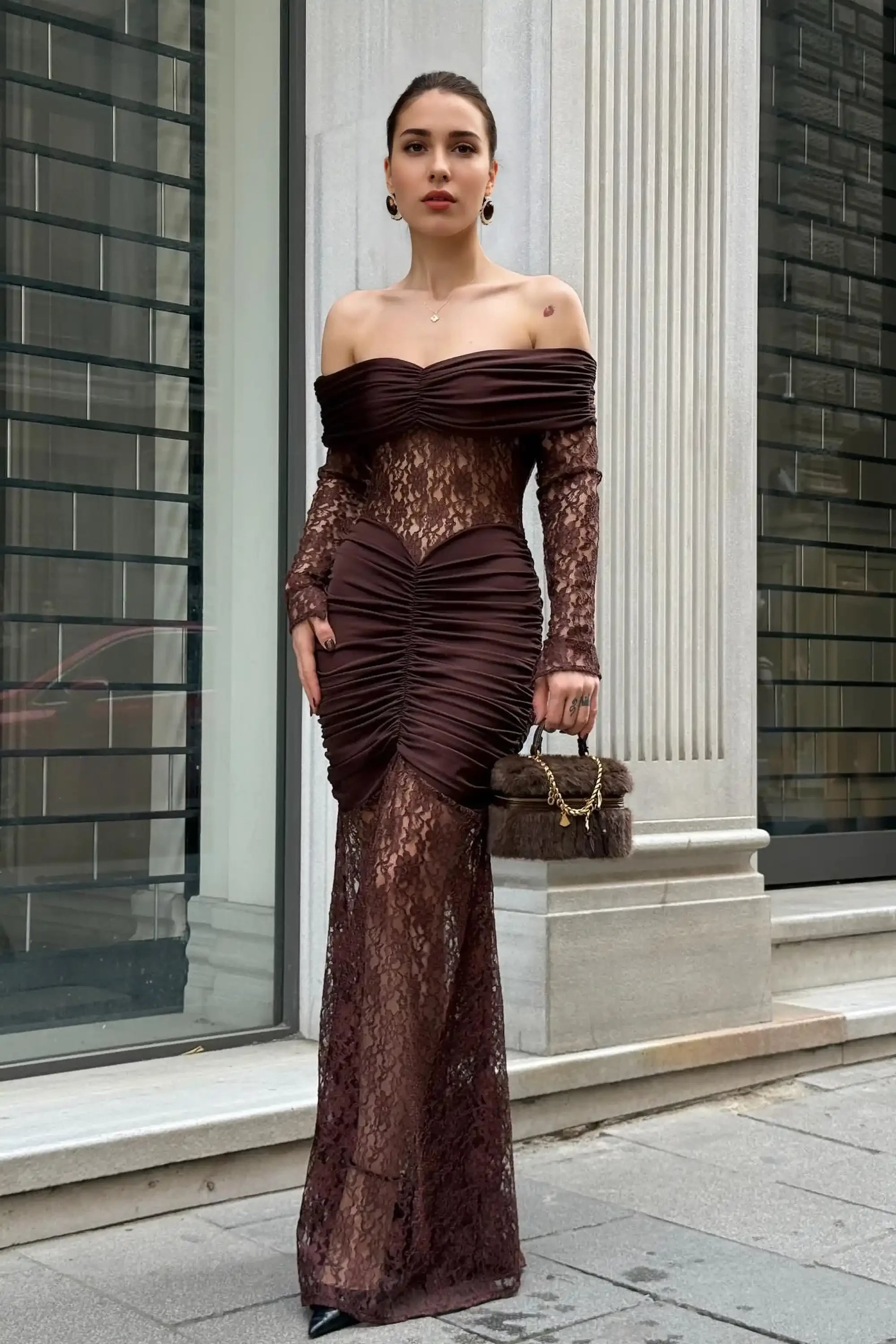 Brown off the shoulder lace dresses like this mermaid maxi style feel soft, elegant, and bold for night wear. This long sleeve dress features sheer floral lace, see through details, and a corset style bodycon fit that shapes the waist nicely. The ruched jersey fabric is stretchy and comfortable, with split sleeves and a dark romantic look made for special moments. Ideal for mermaid maxi dresses, this style fits party, formal dinner, gala, and cocktail moments, finishing beautifully among luxury evening dresses.