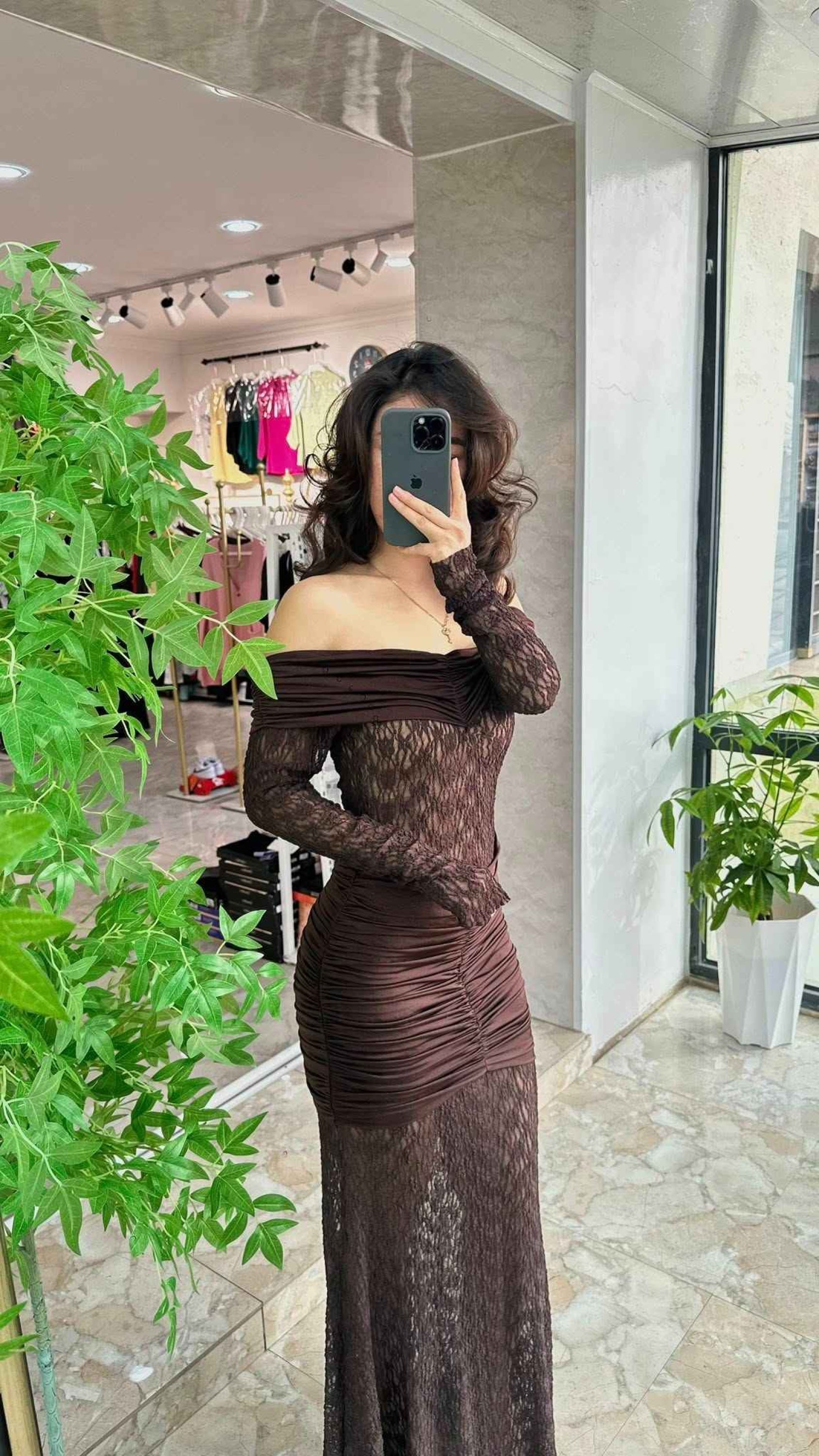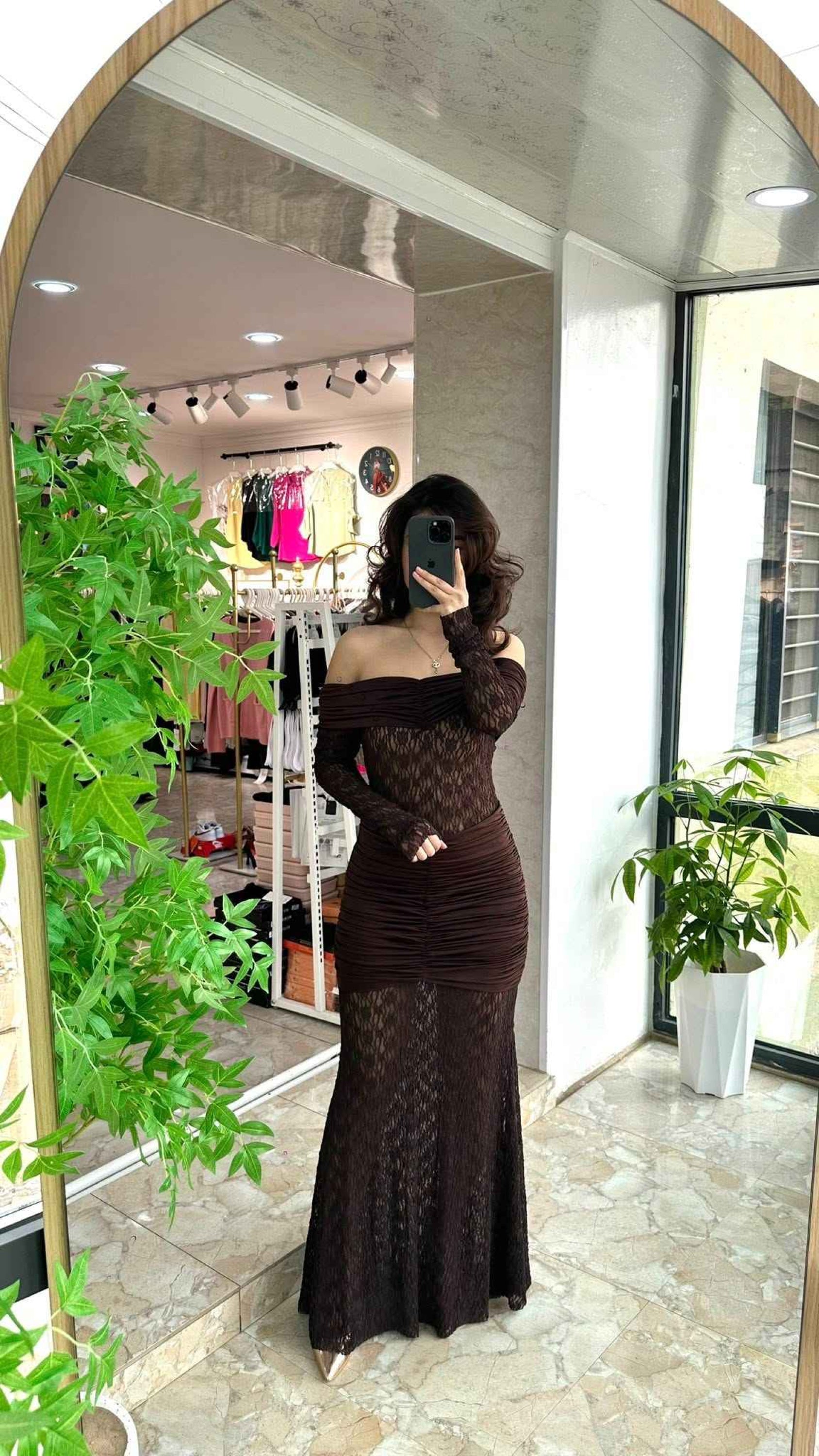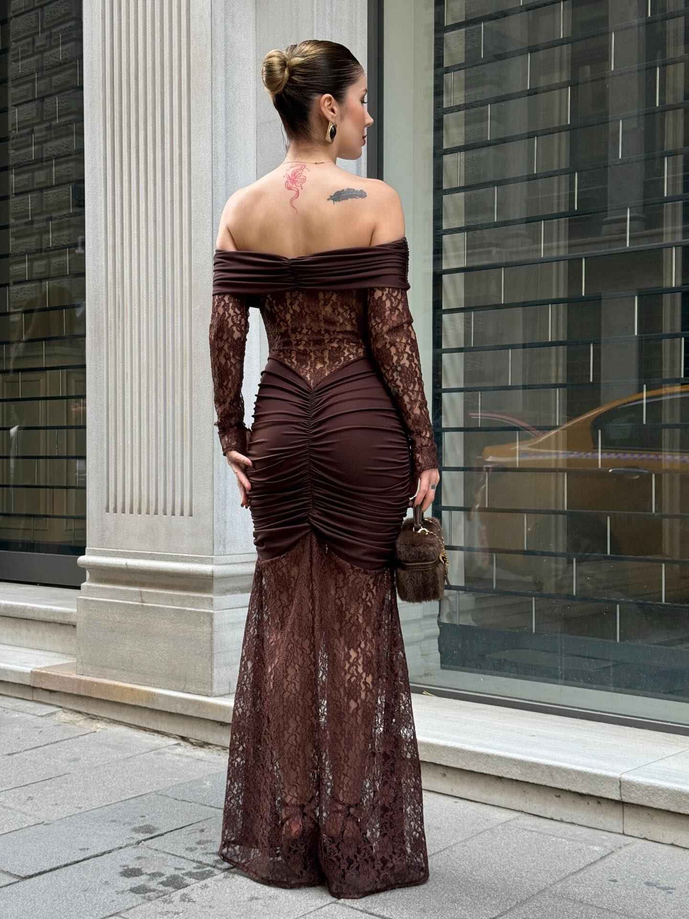Brown off the shoulder lace dresses like this mermaid maxi style feel soft, elegant, and bold for night wear. This long sleeve dress features sheer floral lace, see through details, and a corset style bodycon fit that shapes the waist nicely. The ruched jersey fabric is stretchy and comfortable, with split sleeves and a dark romantic look made for special moments. Ideal for mermaid maxi dresses, this style fits party, formal dinner, gala, and cocktail moments, finishing beautifully among luxury evening dresses.