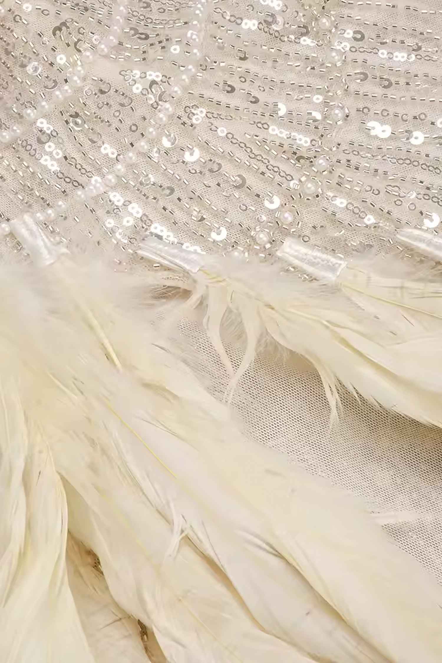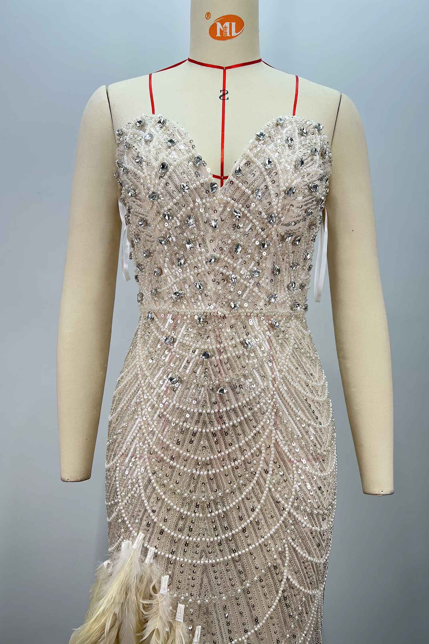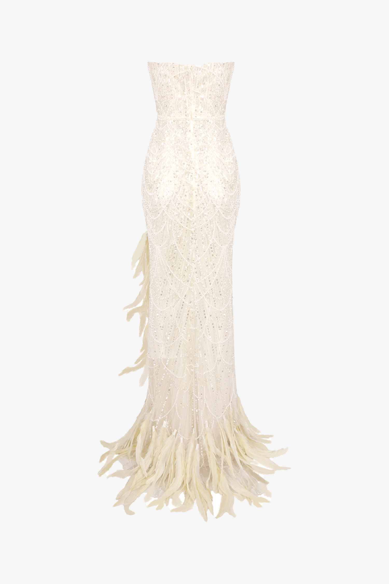 Champagne Strapless Feather Sequin Slit Maxi Dress