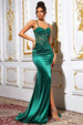 The emerald green lace corset dress comes in soft satin with a ruched mermaid shape and a high split. It’s backless and sleeveless with thin spaghetti straps and a sweetheart wired top that hugs the body. The lace floral design adds a sheer look that feels elegant and perfect for evening or prom night. Zipper on the back and light padded cups make it fit smooth for any formal or date event.