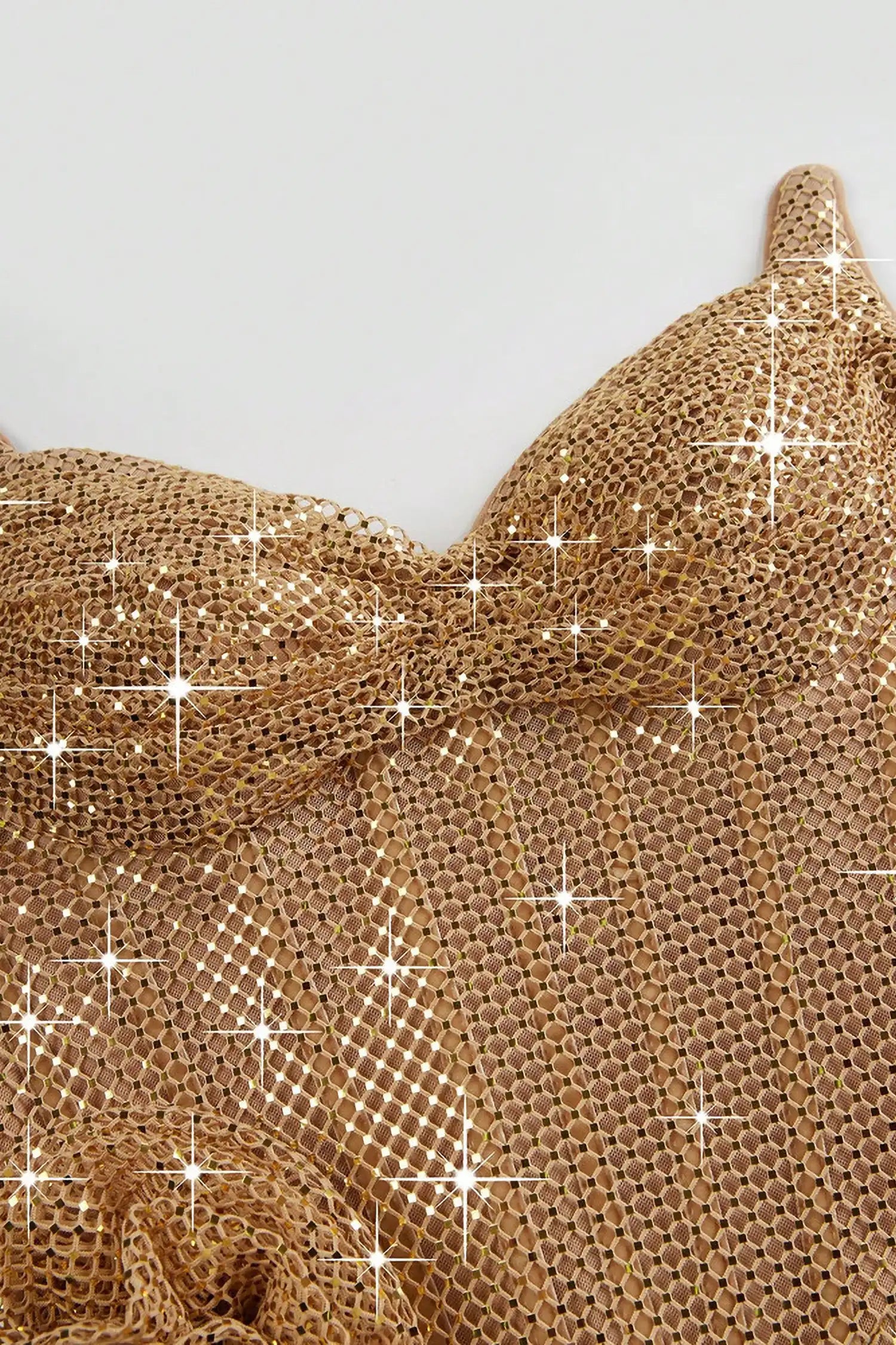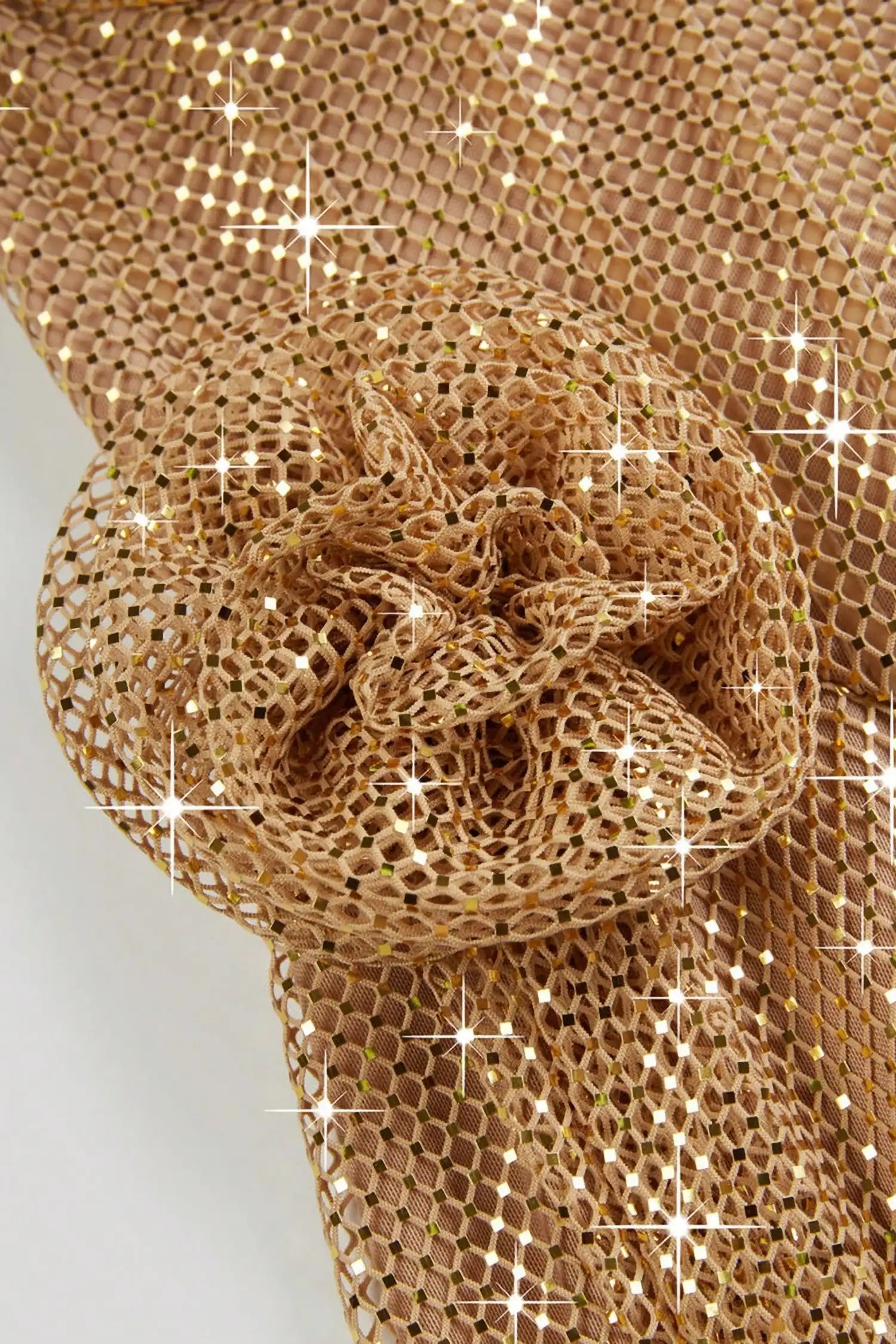 Glow in this gold sparkly maxi dress—bodycon fit, corset cups, sweetheart neckline, sheer mesh over nude lining, 3D floral at hip, thigh split, back zipper. Perfect for gala, reception, pageant, yacht nights, even bridesmaid. Shop more gold, maxi, corset styles and our bridesmaid edit.