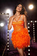 This Orange Feather Embellished Sequin Mini Dress will have you shining bright and looking stunning for any occasion. Designed for women who love bold fashion, this orange mini dress features eye-catching sequins and fluffy feather details that bring out your playful side. The adjustable double spaghetti straps and sleeveless, backless cut give it a striking look, perfect for dancing at a party or turning heads at homecoming. With a sweetheart neckline and cupped design, this bodycon dress hugs your shape, while a zipper makes it easy to slip on. Ideal for evening events, cocktail parties, club nights, summer dates, or spring get-togethers.