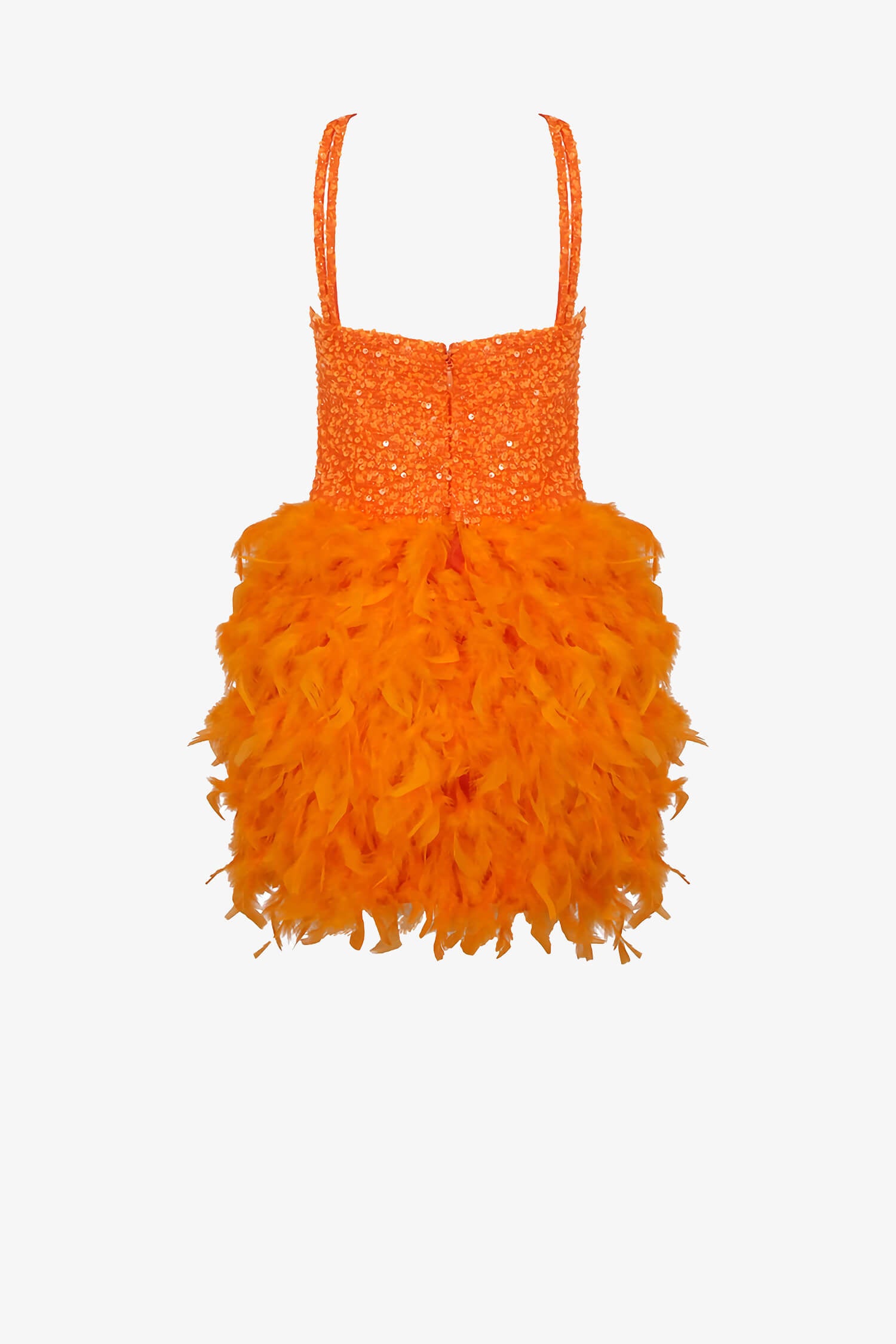 This Orange Feather Embellished Sequin Mini Dress will have you shining bright and looking stunning for any occasion. Designed for women who love bold fashion, this orange mini dress features eye-catching sequins and fluffy feather details that bring out your playful side. The adjustable double spaghetti straps and sleeveless, backless cut give it a striking look, perfect for dancing at a party or turning heads at homecoming. With a sweetheart neckline and cupped design, this bodycon dress hugs your shape, while a zipper makes it easy to slip on. Ideal for evening events, cocktail parties, club nights, summer dates, or spring get-togethers.