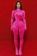 This pink velvet jumpsuit is made to stand out. The soft stretchy crushed fabric hugs the body in a bodycon fit that shapes your curves. It comes with a high turtleneck, long sleeves with glove detail, and a ruched waistband that makes the waist look extra defined. The full length skinny legs give a sleek look and the back zipper makes it easy to wear. Perfect for nights out, parties, or special occasions. You can check more in our jumpsuits collection for different styles.