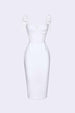 This white midi dress is tight and body-hugging. Made from stretchy bandage fabric. Corset-style with boned bodice for support. Sweetheart neckline with lace trim. Underwired, cupped bust for a lifted look. Sleeveless and backless design. Adjustable bow-tie straps. Hidden zipper at the back. Pencil skirt with a small split for easy movement. Perfect for weddings, dates, cocktail parties, and formal events. Works for spring, summer, fall, and winter. Great for homecoming, holidays, and evening dinners. Elegant but flirty. Wear to a party or special occasion. Simple yet stylish.
